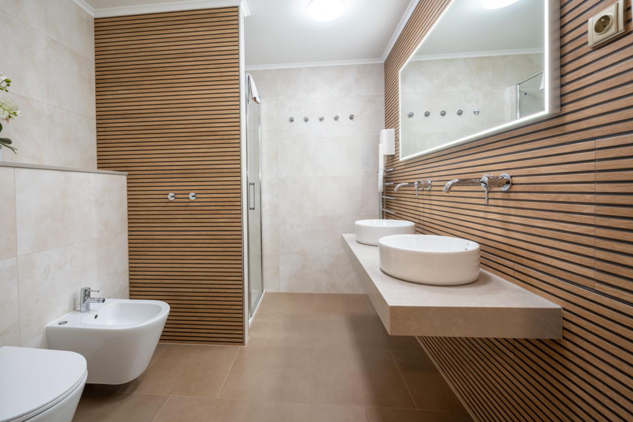 (pětilůžkový apartmán s manželskou postelí, jedním plnohodnotným lůžkem a pohodlnou rozkládací pohovkou pro dva, klidnější část hotelu, s vlastní předsíňkou, klimatizací, lednicí a luxusně vybavenou koupelnou s dvojumyvadlem a bidetem)